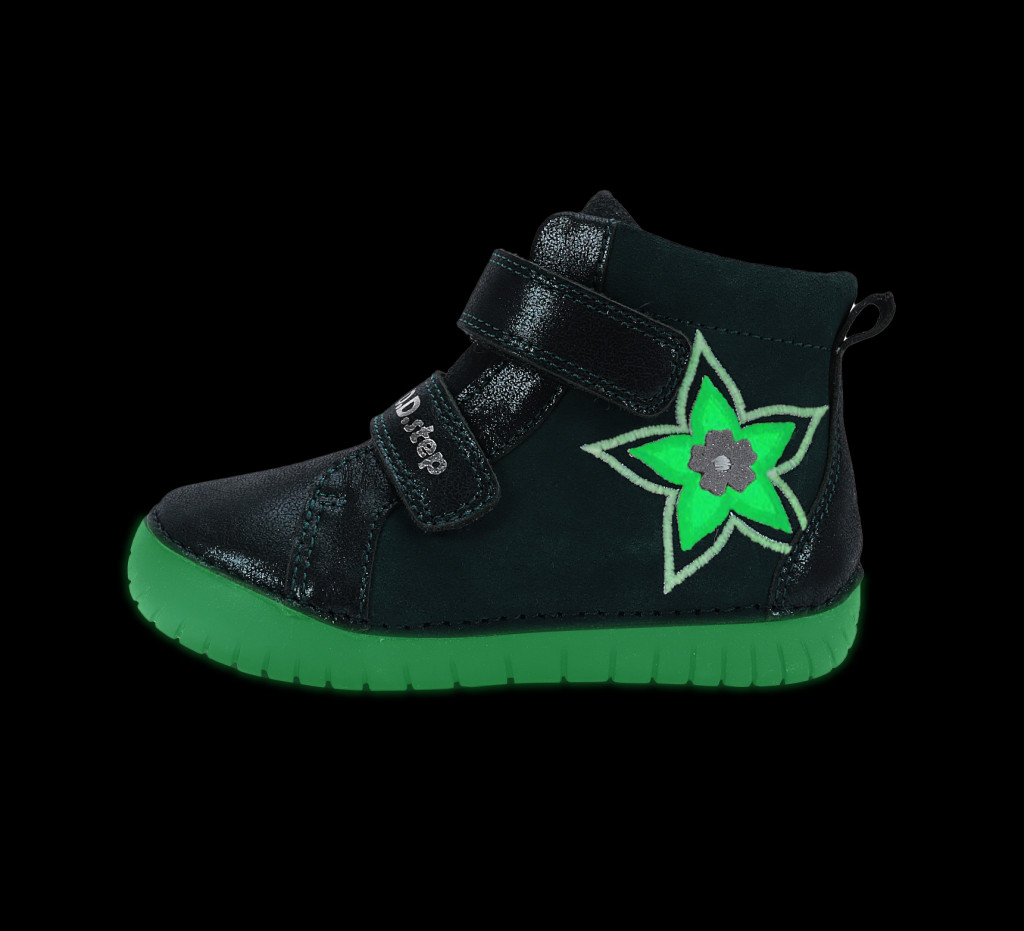 A cipő különleges, fluoreszkáló talppal rendelkezik, amely napfény hatására feltöltődik, és sötétben világít, így nemcsak izgalmas élményt nyújt a gyermekek számára, hanem extra láthatóságot is biztosít, például esti séták során. A minőségi bőr felsőrész és bélés gondoskodik a kényelemről, valamint a megfelelő szellőzésről, így a cipő hosszabb ideig is kényelmes viselet marad.